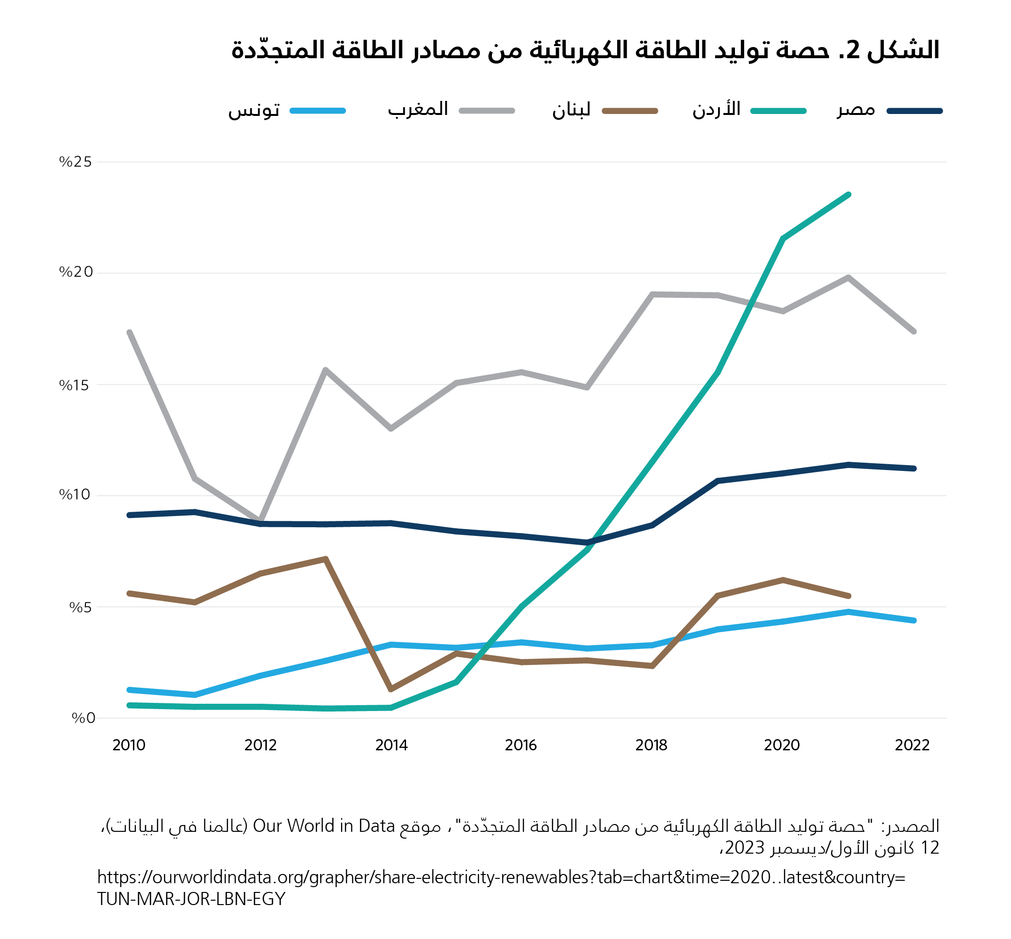في المقابل، تخلّفت مصر وتونس ولبنان عن الركب في التحوّل إلى مصادر الطاقة البديلة. ففي العقد الماضي، ارتفعت حصّة مصر من مصادر الطاقة المتجدّدة في توليد الكهرباء من 9.36 في المئة في العام 2011، إلى 12 في المئة فقط في العام 2022.125 وتونس بدورها واجهت تحدّيات جمّة، حيث لم تشكّل مصادر الطاقة المتجدّدة سوى 4 في المئة من إنتاج الكهرباء في العام 2021.126 أما لبنان، فانتقل من إنتاج 5 في المئة من كهربائه بواسطة الطاقة المتجدّدة في العام 2011، إلى إنتاج 9.38 في المئة منها في العام 2021.127 كان هذا التطوّر الإيجابي ذا أهمية، لأن الأزمتَين الاقتصادية والمالية أرغمتا الكثير من الناس على الاستثمار في الطاقة الشمسية نظرًا إلى التكلفة الباهظة للوقود الأحفوري. مع ذلك، كان الانتقال إلى الطاقة الشمسية عشوائيًا إلى حدٍّ كبير، في ظلّ إشرافٍ وتنظيمٍ محدودَين من مؤسسات الدولة، وهما مهمّان لتجنّب المشاكل البيئية في المستقبل.128 لذا، لا بدّ من سدّ الثغرة في مجال الطاقة المتجدّدة في مصر وتونس ولبنان كي تتمكّن هذه البلدان من تحسين أمن الطاقة لديها، وخفض اعتمادها على الوقود الأحفوري، وتخفيف حدّة صدمات أسعار الطاقة.