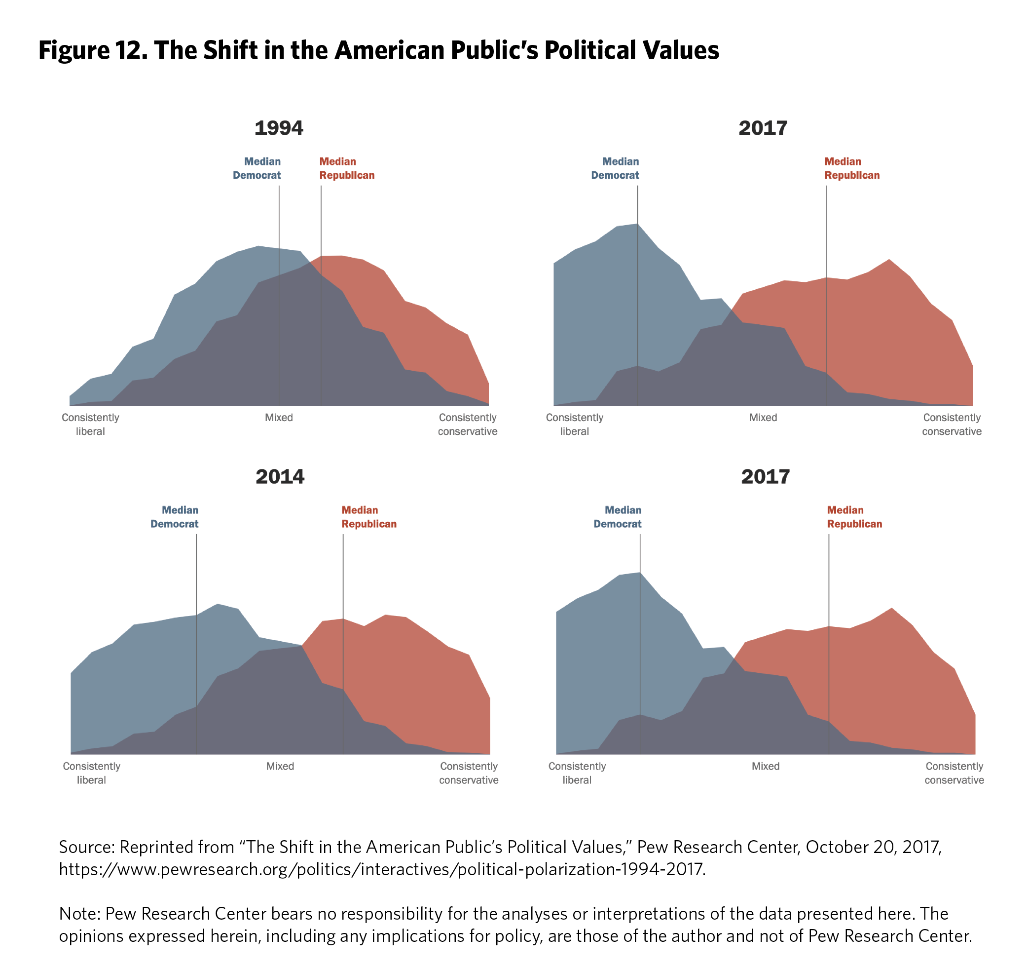 A frequent misunderstanding is that people who hold ideological views that contain elements from both sides of the aisle are moderates because they fall in the middle of the left-right spectrum. In fact, a Democracy Fund survey in 2018 found that Americans who held the least polarized ideological beliefs were actually the voting cohort least in favor of democracy and most supportive of a “strong leader” who does not need to bother with Congress or elections.43