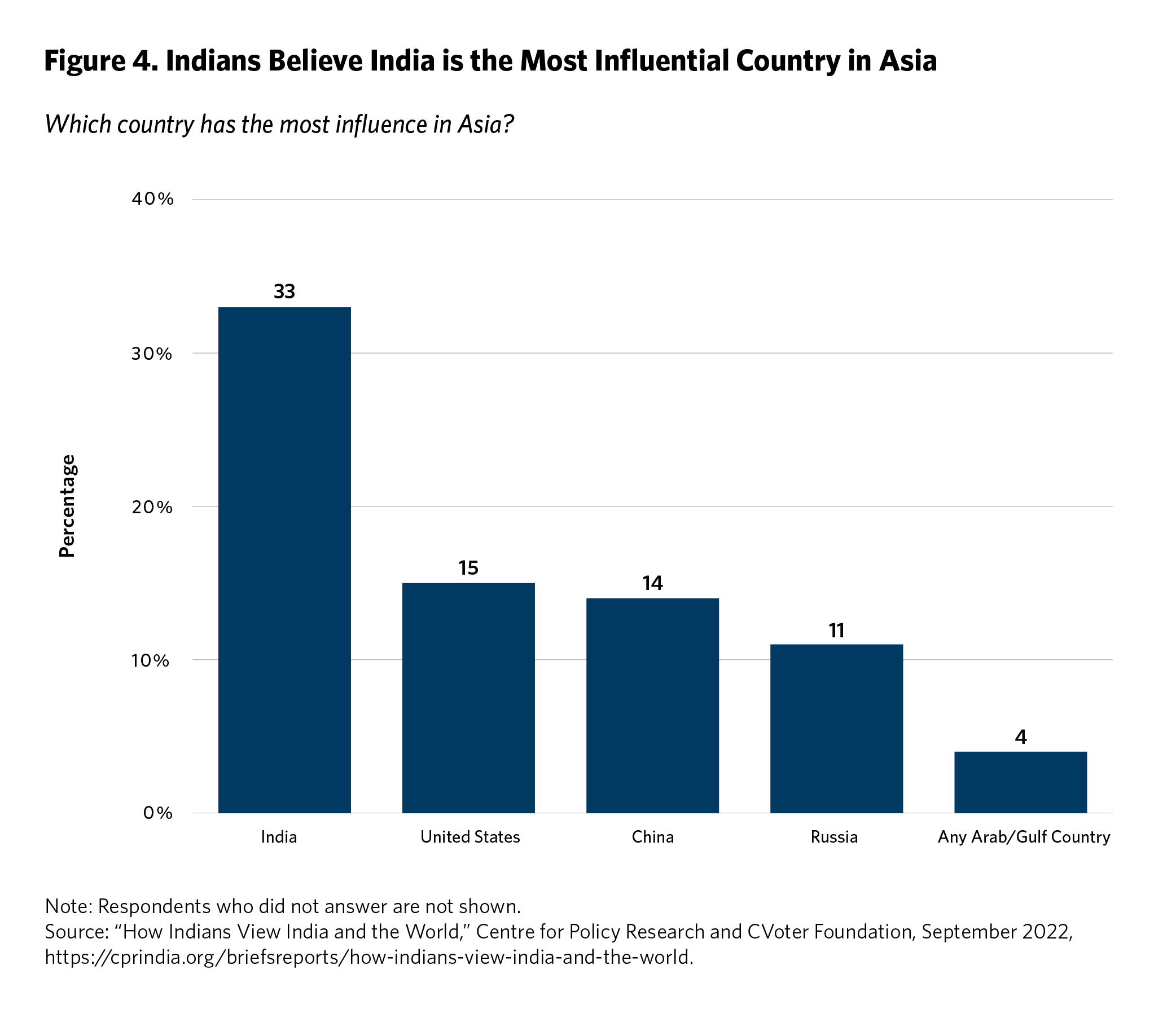 Indians hold especially positive views about their country’s role in their neighborhood. In a nationally representative 2022 survey conducted by CVoter and the Centre for Policy Research (CPR), 33 percent of Indian respondents reported that India wielded the most influence in Asia, with the United States a distant second at fifteen percent and China a hair below at fourteen percent (see figure 4).